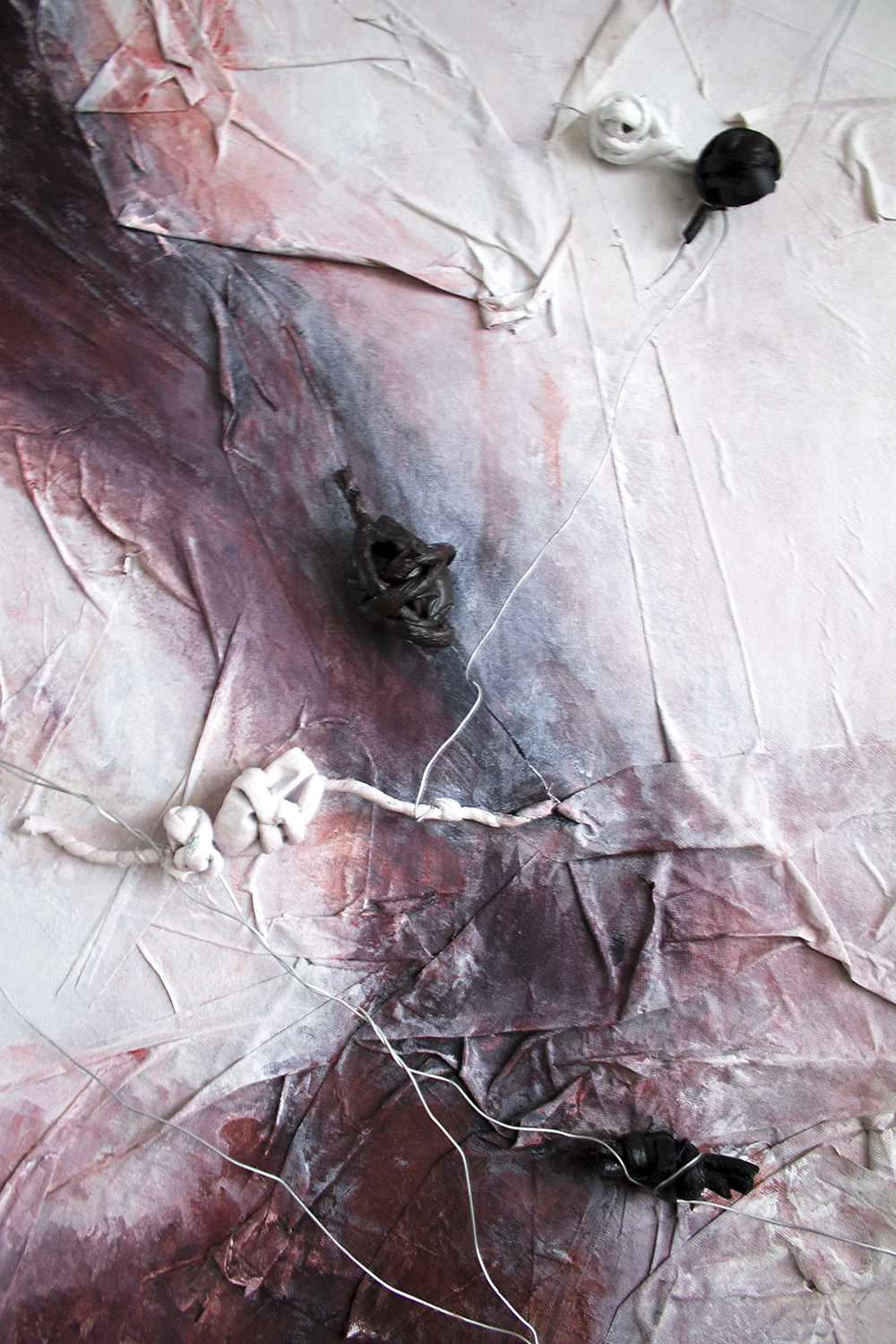 Son travail artistique se concentre sur les conséquences de ces derniers sur notre santé psychologique et physique. Son processus créatif est une réflexion autour de la matérialisation des états psychologiques et des enjeux identitaires résultant de cette confrontation intérieure animer par ces héritages psychiques. L’artiste tente d’exposer la vulnérabilité qui habite chaque individu et de montrer la complexité humaine au travers d’expériences émotionnelles.